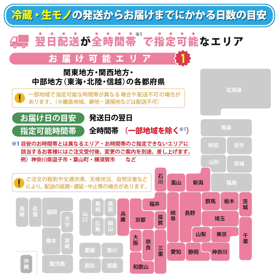 関東地方・関西地方・中部地方(東海・北陸・甲信越)[離島僻地等を除く] (配送不可エリアからのお客様のご注文) 「冷凍便」が可能なエリアのお客様は、「冷凍品」扱いへと自動的変更のご対応。お客様が取れない場合・冷凍便であっても配送不可エリアの場合は【キャンセル処理】致します。 |