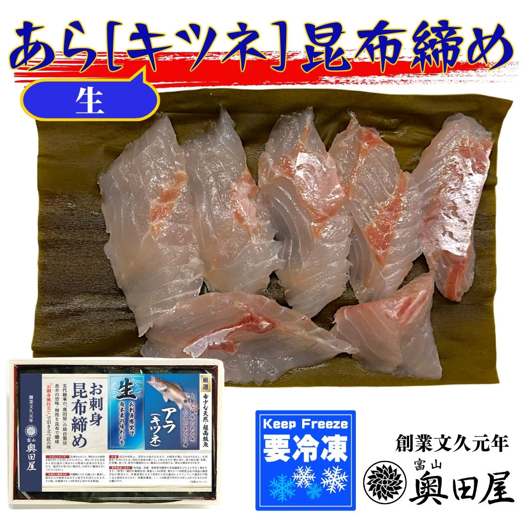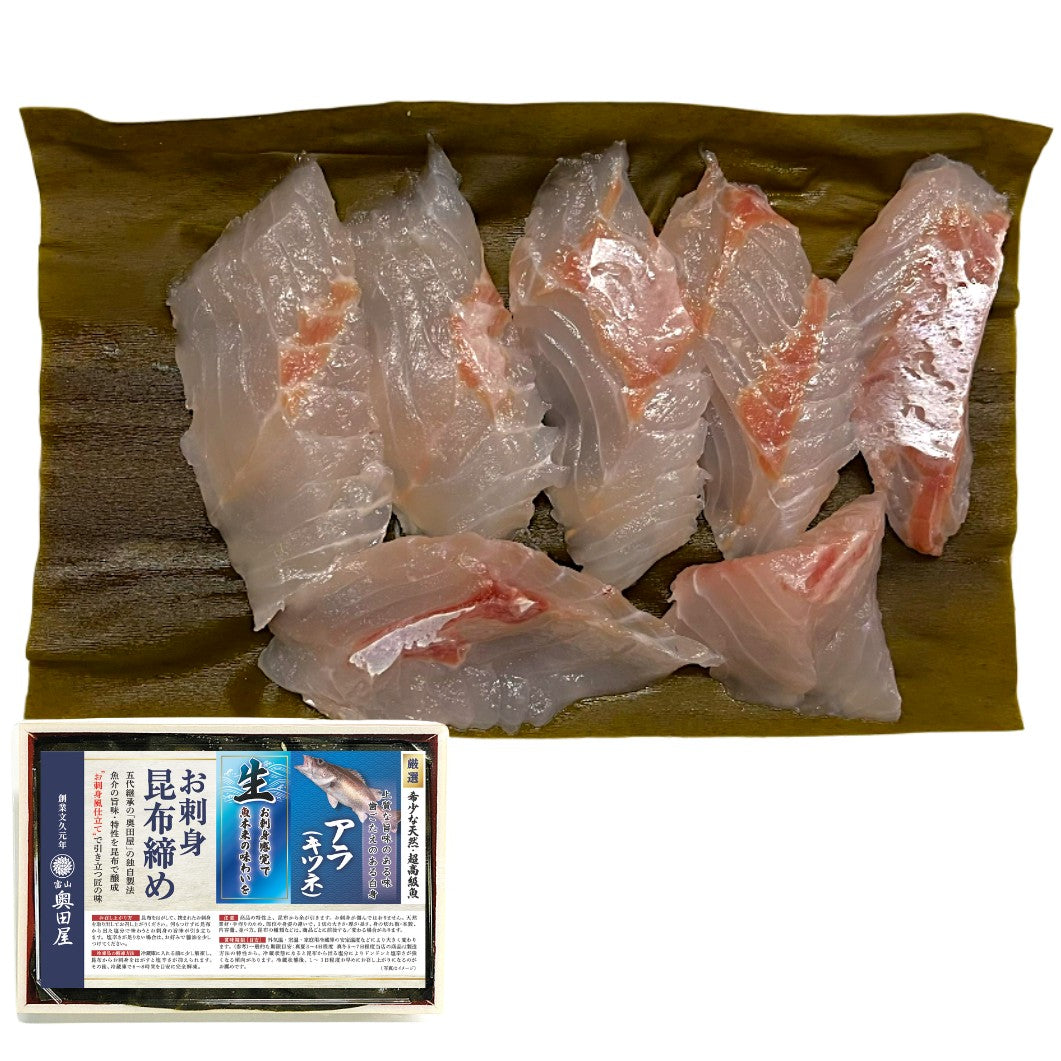 「幻の高級魚」として珍重されるアラ(キツネ)を五代継承の富山の老舗魚やの目利きと伝統の技で贅沢な高級昆布締めに